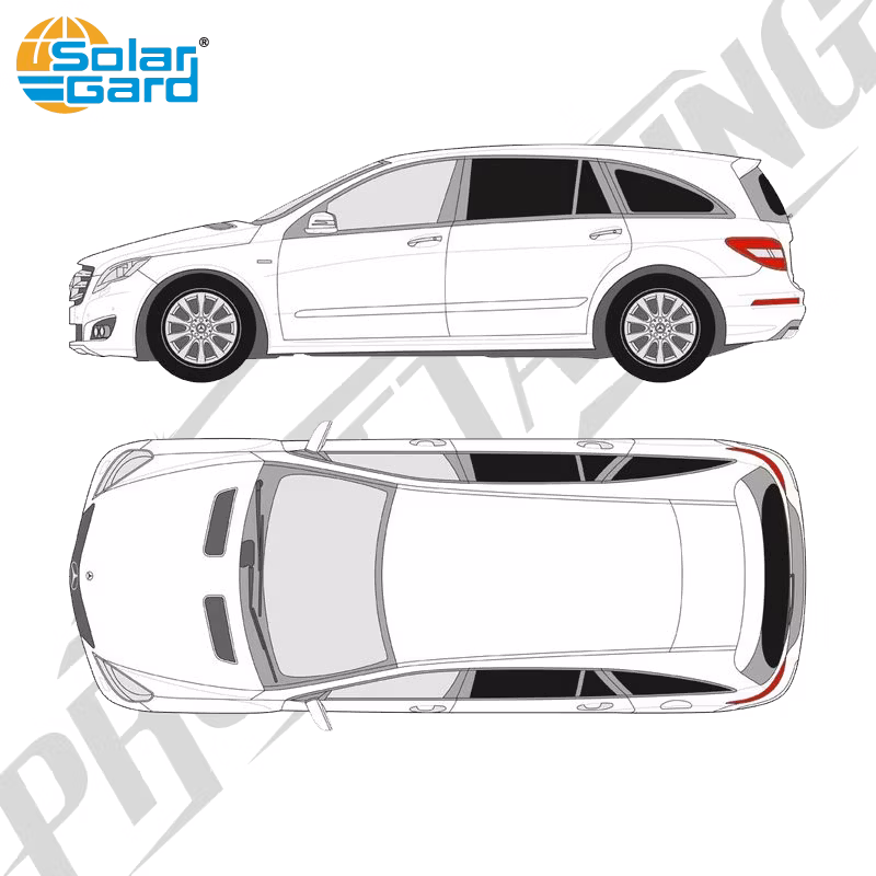 Färdigskuren solfilm till Mercedes-Benz R-Klass lång alla årsmodeller. Färdigskuren solfilm från Solargard. Samma film som proffsen använder!