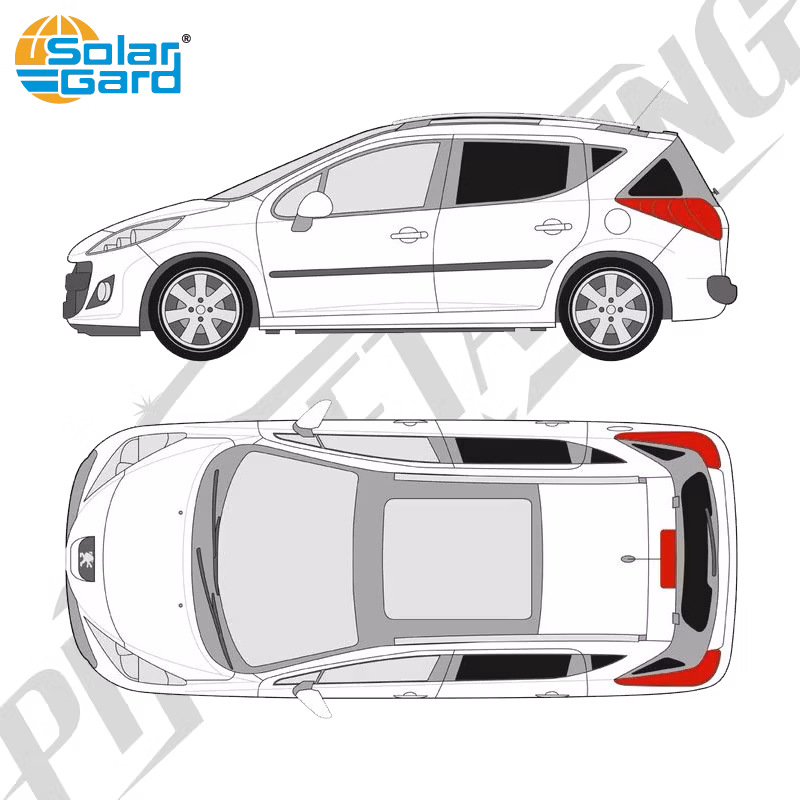 Färdigskuren solfilm till Peugeot 207 SWSolfilmen är färdigskuren efter din bilmodell. Solfilmen är en formbar klisterfilm med fantastiska krympegenskaper, exak