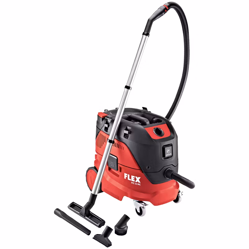 Säkerhetsdammsugare från Flex med manuellt filterrengöringssystem och en behållare på 30 liter. VCE 33 L MC har en högpresterande turbin som garanterar både hög sugkapacitet och högt vakuum. Inbyggd vibrationsknapp och flatvecksfilter med teflonbeläggning / nano beläggning medger ett optimalt utnyttjande av behållarevolymen. Inbyggt eluttag både med permanent ström och automatiskt on/off-funktion. För att minimera risken för ett vakuumsug på ytan under slipning finns det en flödesomkopplare. Elektronisk vätskeövervakning gör våtsugningen till en barnlek.