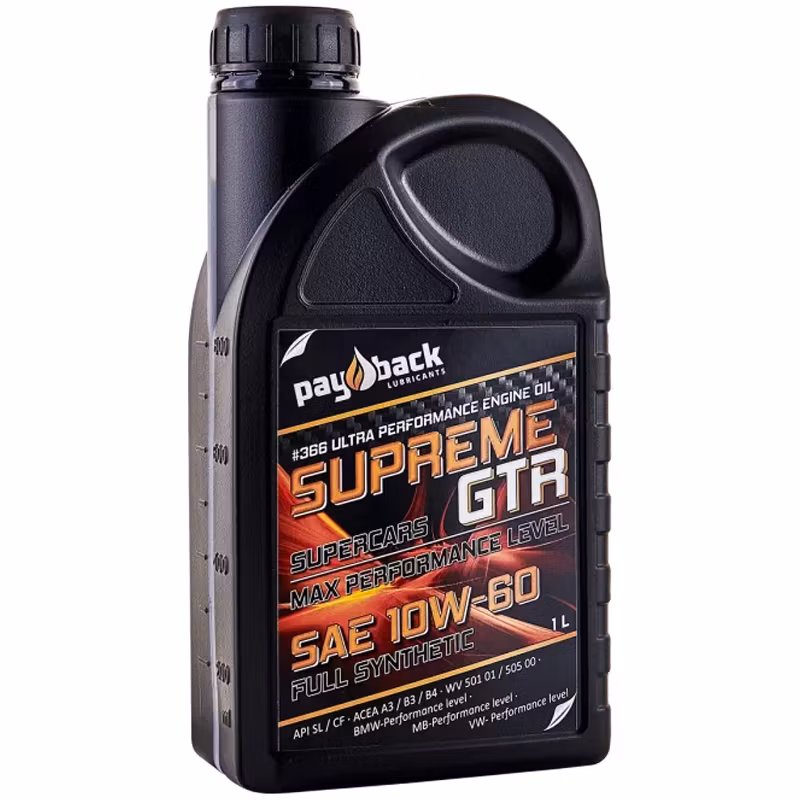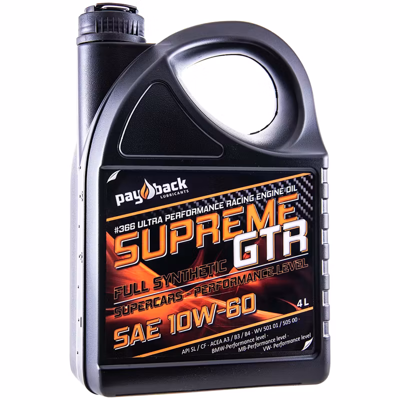 SUPREME GTR 10W-60 från Payback är en extrem, helsyntetisk motorolja för SuperCars och högeffektsmotorer. För gatbruk och proffisionellt tävlingsbruk. Den högpr