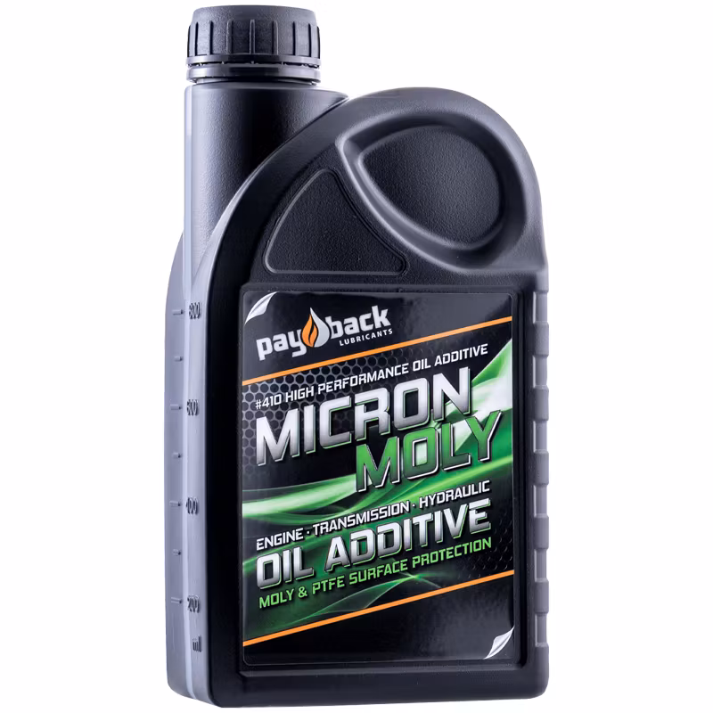 #410 Micron Moly från Payback är en multifunktionell oljeförstärkare. Ökar oljans viskositet, bärighet och den tätande förmågan samt minskar friktion, ljud och