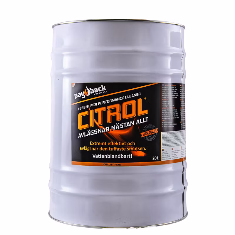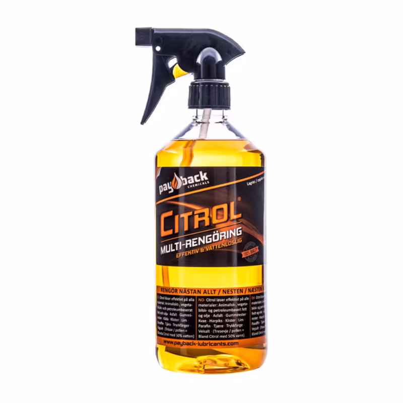CITROL® från Payback är bland det effektivaste som finns vid rengöring. Rengöringsmedlet är baserat på citrusskal och är helt petroleum, alkaliskt och syrafritt. Lätt biologiskt nedbrytbar, vattenlöslig och löser de flesta orenheter. Citrol har varit det effektivaste allroundrengöringsmedlet i USA under decennier.