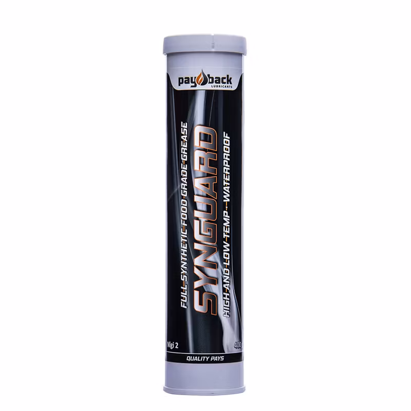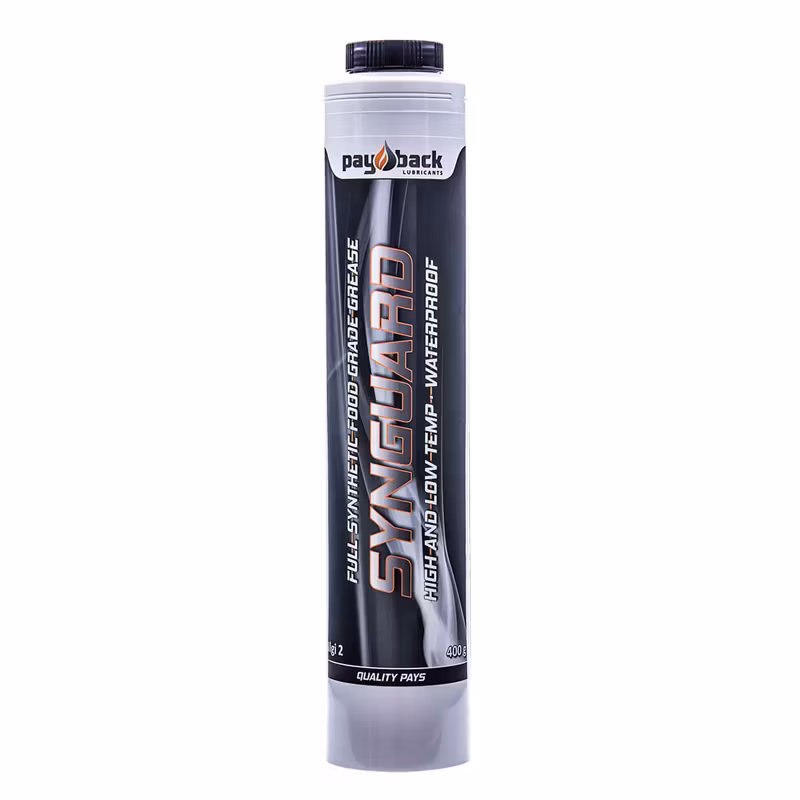 SYNGUARD -H1 från Payback är ett helsyntetiskt, livsmedelsklassat smörjfett med förtjockare av Bentonit. För applikationer med tryck, vatten, vattenånga, låga o